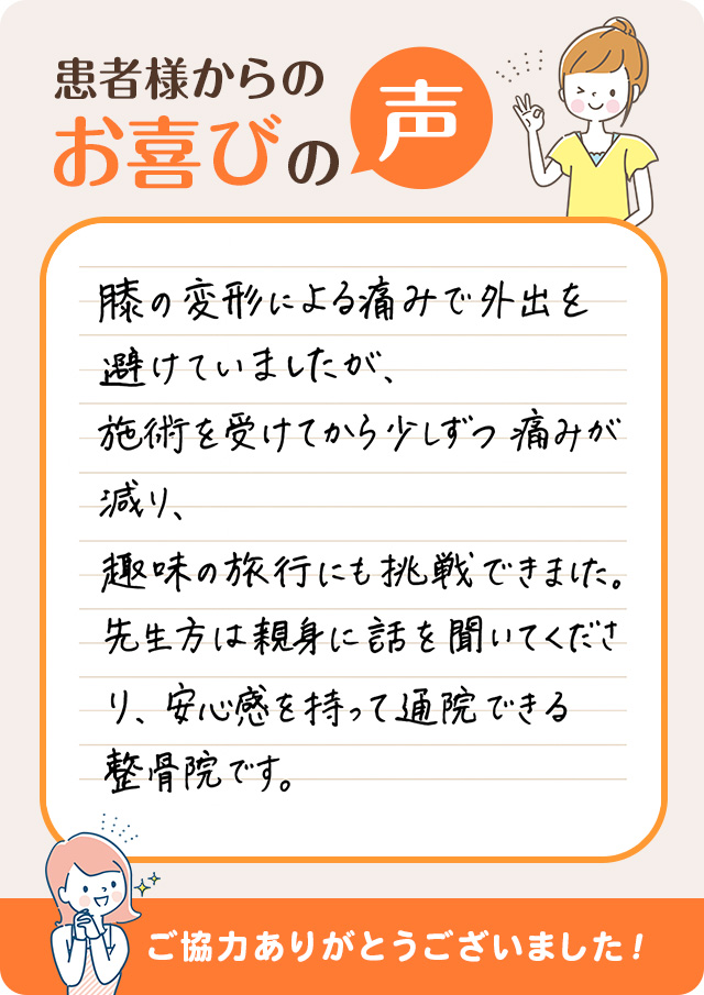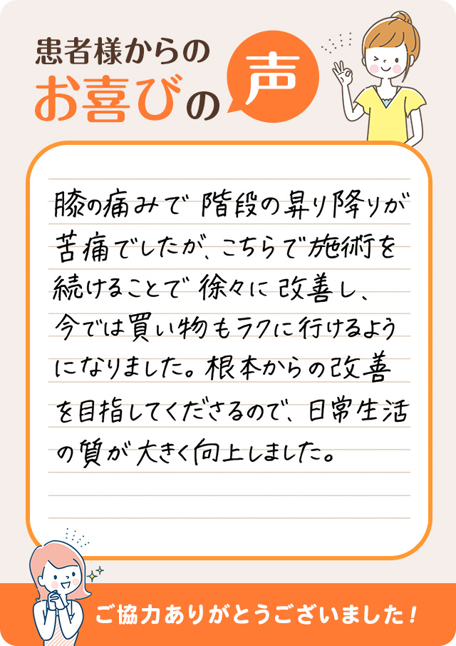 膝が痛くて、整形外科へ行きました。全然治らないけど、先生が勧めるので、ずっと通っていました。でも治らないので、なかむら整骨院さんへ行きました。中村先生は、「大丈夫」と、心強いお言葉を下さいました。1ヶ月経った頃、本当に段差とか階段がましになってきました。階段を降りる時の痛みは、もう少し掛かりますと言われましたが、本当に良かったです。