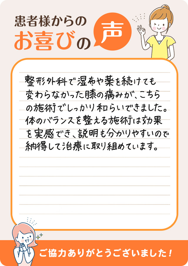 先生もよく話を聞いて下さり良かったです。正座が出来るようになるまで通い続けたいです。